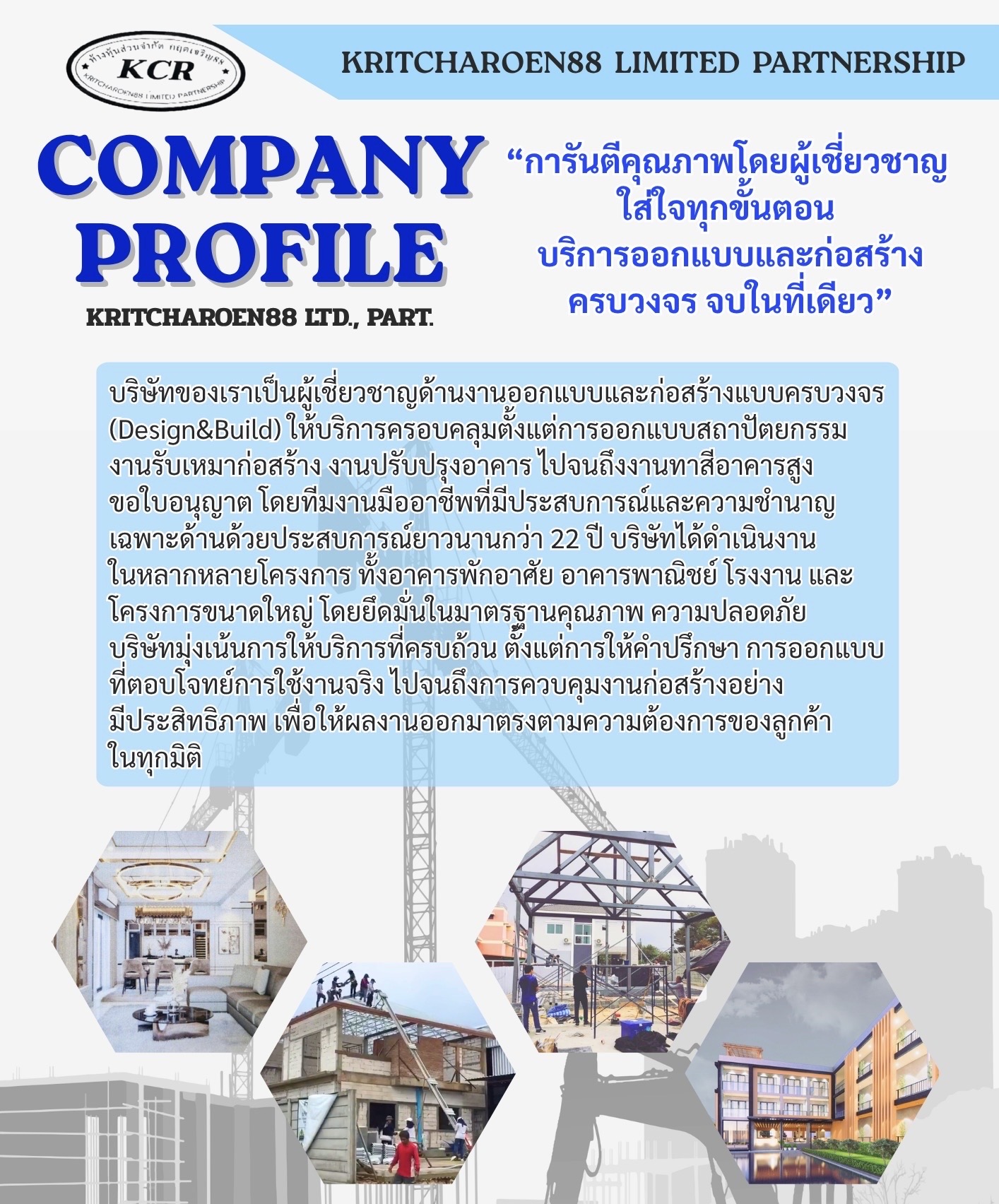 ในปัจจุบัน บริษัทของเราได้ดำเนินธุรกิจมาเป็นเวลา 22 ปี ด้วยมาตรฐานการทำงานและการส่งมอบงานที่สมบูรณ์อย่างต่อเนื่อง เราสามารถตอบสนองความต้องการและความพึงพอใจของลูกค้าได้อย่างเต็มที่ บริษัทของเราได้รับความสำเร็จอันดับต้นๆในการให้บริการด้านการออกแบบทั้งภายนอกและภายใน รวมถึงการก่อสร้างโครงการต่างๆมากกว่า 100 โครงการ เรายึดมั่นในหลักการทำงานที่มีคุณภาพและมุ่งมั่นที่จะก้าวสู่การเป็นบริษัทชั้นนำที่ดีที่สุดในประเทศไทยอีกขั้นหนึ่ง